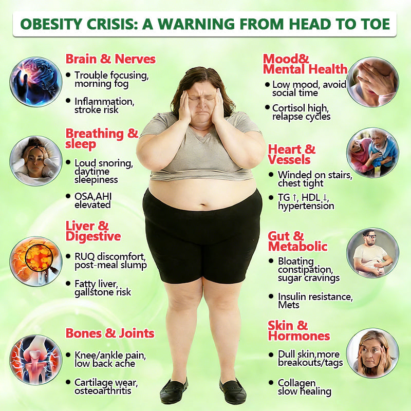 • Cancer Risk: Increases cancer risk by 50% compared to those at a healthy weight.